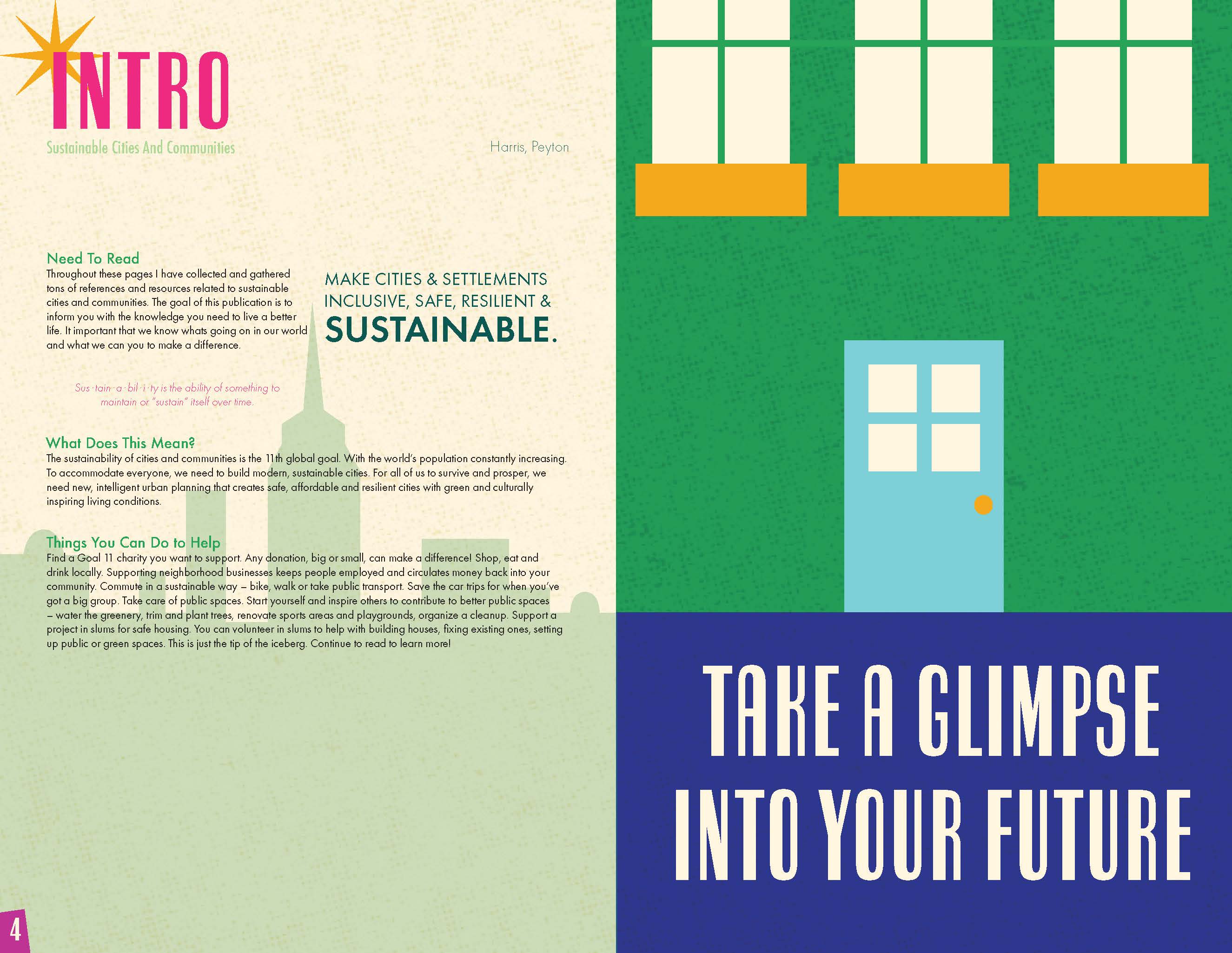 Vision is a sustainabiltiy magazine purposed with spreading awarness of the UN’s 11th global goal. This specfic series titled What Happened To Tomorrow is about the impact and possibilities of sustainable cities and communities. The style of the magazine is inspired by 50’s Retro Futurism comic art where the idea of a “great tomorrow” comes from. The magazine discusses the end of the “great tomorrow” and how our recent environmental decisions have changed our views of the future and how our tomorrow may never come.